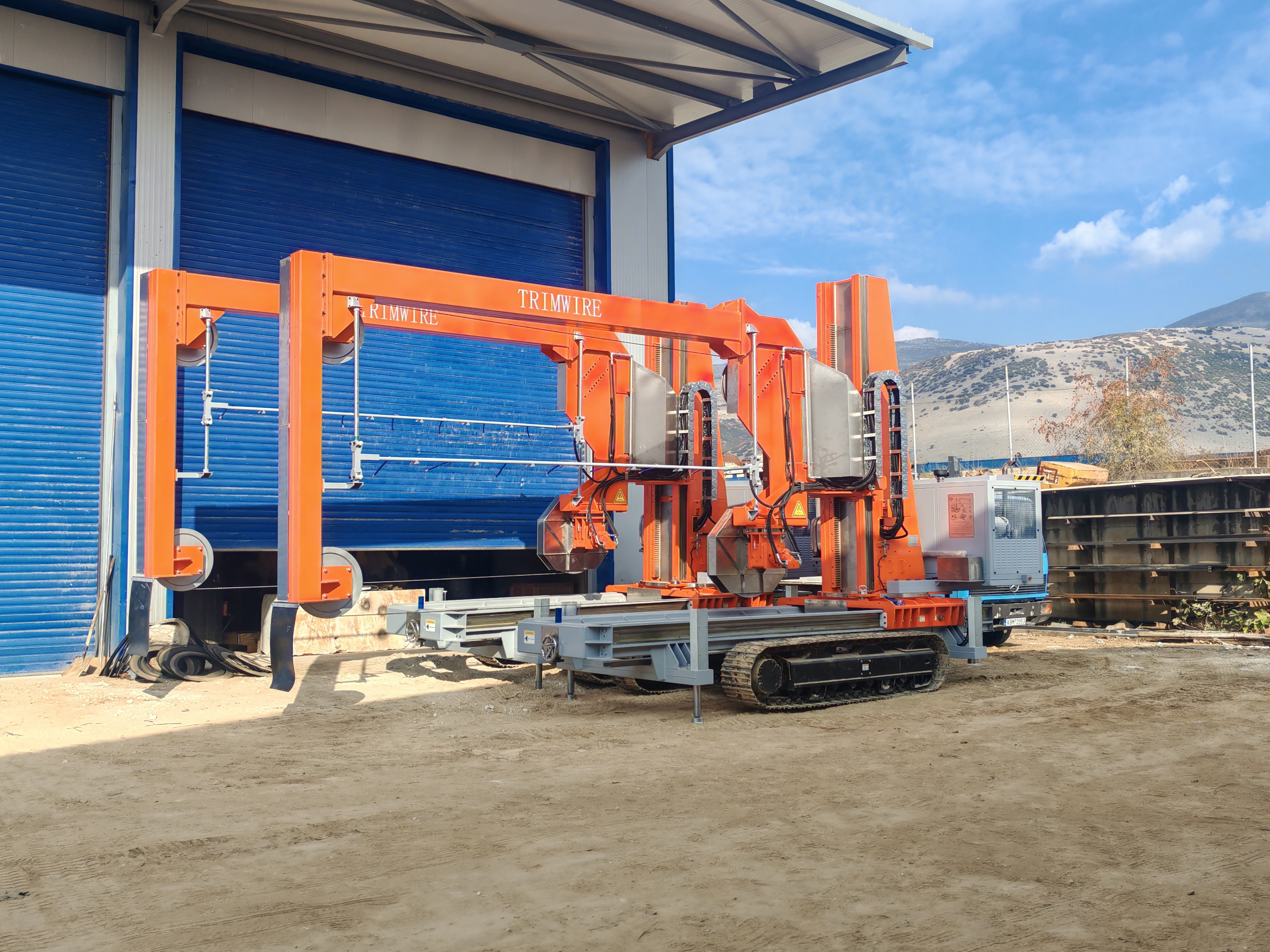 Equipped with 4 hydraulic stabilizers, the cutting arch is rotated and brought to the desired height, thus aligning the wire to the face of the block to be cut. The arch structure slides vertically along the column, while the wire is driven by a motor flywheel and guided by guidewheels. Moreover, the entire structure can move along the rails (4 meters) placed on the top of the vehicle to realize perfectly parallel cuts and inclined cuts through the combination of the movements.